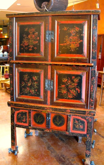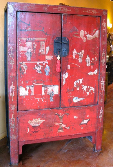 This Chinese antique red lacquer cabinet is one of our favorite pieces. It is from early to mid 19th century Shanxi Chinese province and is in all original condition. Scholars and court officals adorn the lacquered doors. The quality construction and painting indicate this cabinet was the property of a wealthy family.