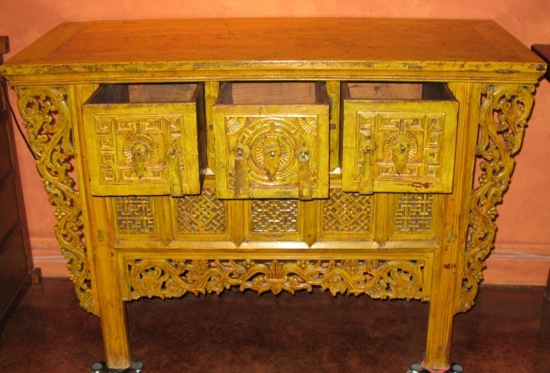 Fabulous old elmwood coffer circa 1890′s or older from Shanxi Province. Three drawers and wonderful carving. Large storage space below the drawers. Additional photos of any Asian Antiques’ cabinet available on request.