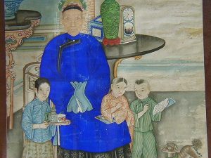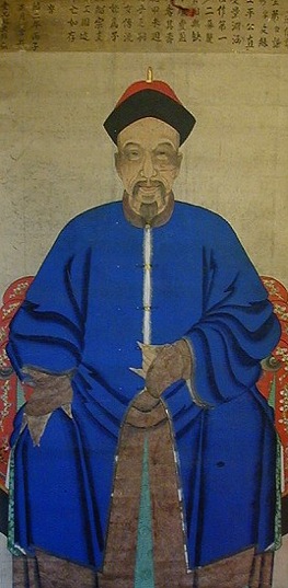 This an ancestral portrait of a wealthy merchant wearing blue silk robes; circa 1890-1920. It is in remarkably good condition.