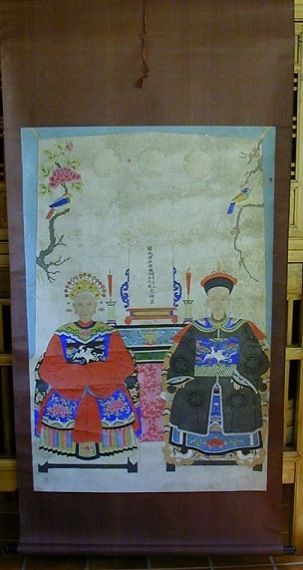 Ancestral portrait of elderly couple circa 1850-1890. The gentleman in the portrait was a high official in the Qing government, known by the white crane Mandarin square on his garment. As a young man, he was apparently married to a much older girl,probably in an arranged marriage, as seen by their appearance in later life.