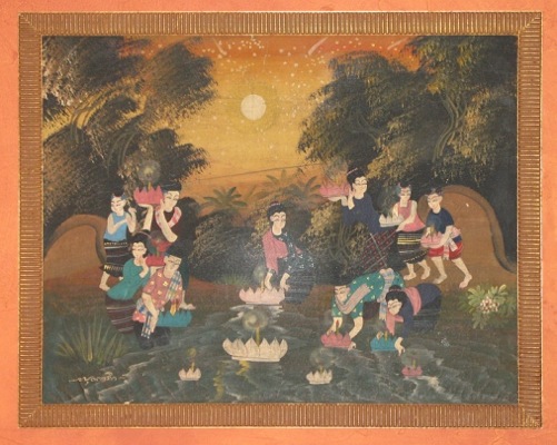 This original acrylic on wood in gilded wood frame depicts Thai women launching offerings during San Kratong festival. Local Chang Mai artist, Thailand, 1995.