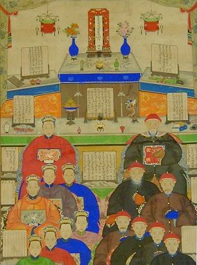 This stunning group Ancestral Portrait originates from the mid to late 19th century China. The white bird emblem on the garments signifies a very high ranking family closely associated with the Imperial Court. With still brilliant colors, this extra long portrait has been carefully lifted from its original backing and and has been remounted with a new backing.
