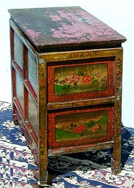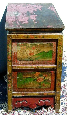 A small 19th century Tibetan cabinet scenery painted on all sides with monasteries, florals, dragons; great condition; 29" high x 32" wide x 18" deep.