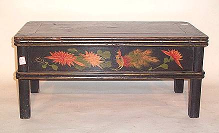 A low, kang table used on the day bed for eating, drinking tea, reading; unusual to find one painted; c 1900 Shanxi Province, elmwood, apprx. 14" high x 23" wide x 16" deep.