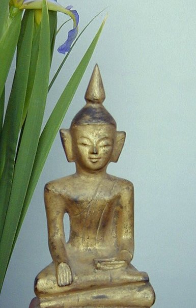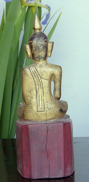 Beautiful 19th C Thai Lanna Buddha carved in teak with guilding and red lacquer. Minor spliting on back; 8" high x 3" wide x 3" deep.