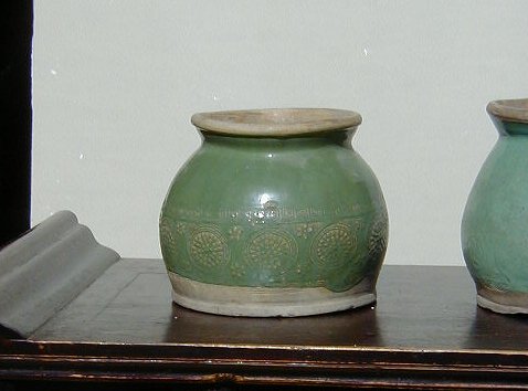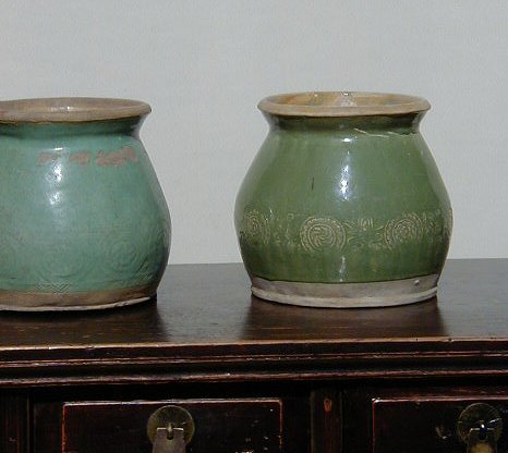Here are two great antique celedon pots from Northern China. Each has hand imprinted decoration and each measures approximately 9" tall x 9" diameter.