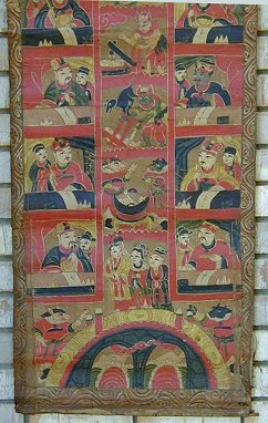 | yao3 | This is the third in the set of four Yao Ceremonial Scrolls. Each scroll is painted on handmade, layered paper which is carefully stitched along the borders. This piece depicts a series of Daoist Dieties and Devotees who assist the Gods in their work. |