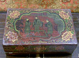 | bxmwa1 | Painted lacquer gift box circa 1880-1910 Shanxi Province. All hardwood box with 12 small metal dishes inside; used for gift giving; 6" high x 17.5" wide x 11.5" deep; some retouching to the original painting. |