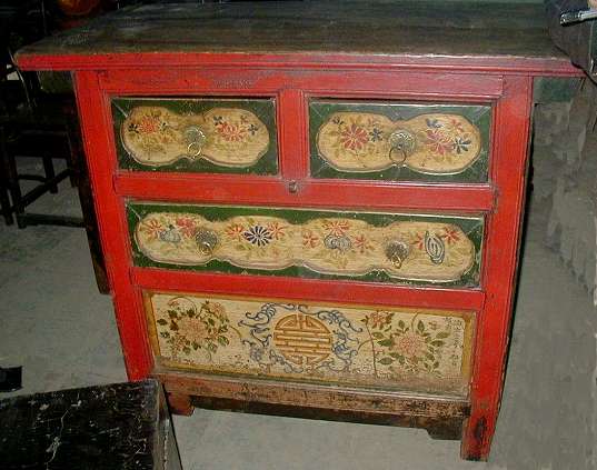 | scabch432 | Mongolian coffer with drawers circa 1900 Inner Mongolia; 40" high x 46" wide x 24" deep; all original condition with traditional painted 'sho' design for longevity. See this and other great asian pieces at Rich Designs of Colorado Springs Colorado. |