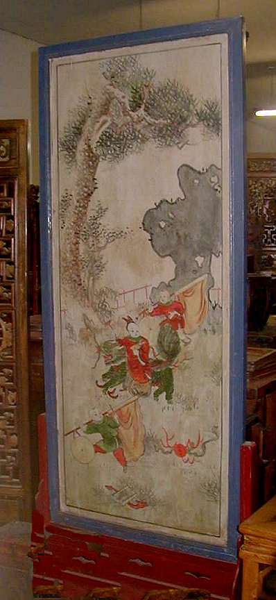 One panel painted screen on red lacquer stand depicting a lively peasant scene; circa 1890-1900. Approx. 62" high x 35" wide.